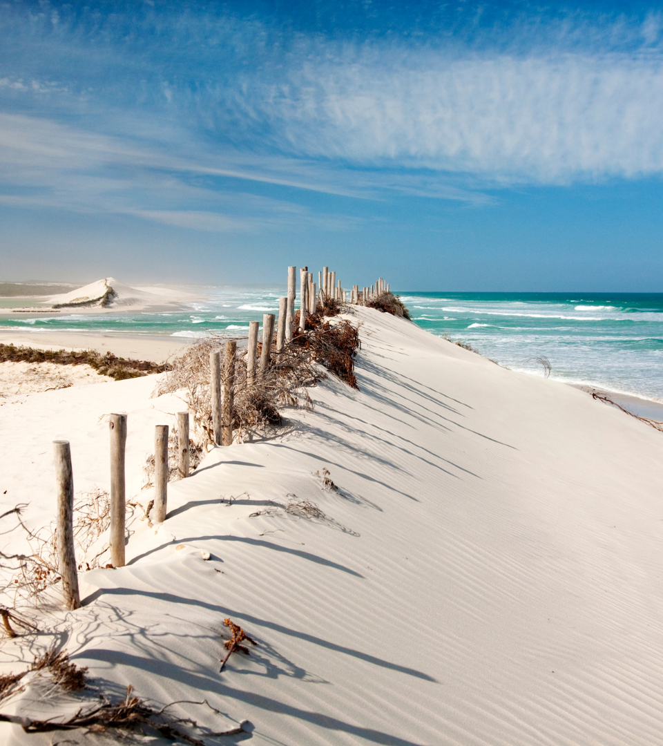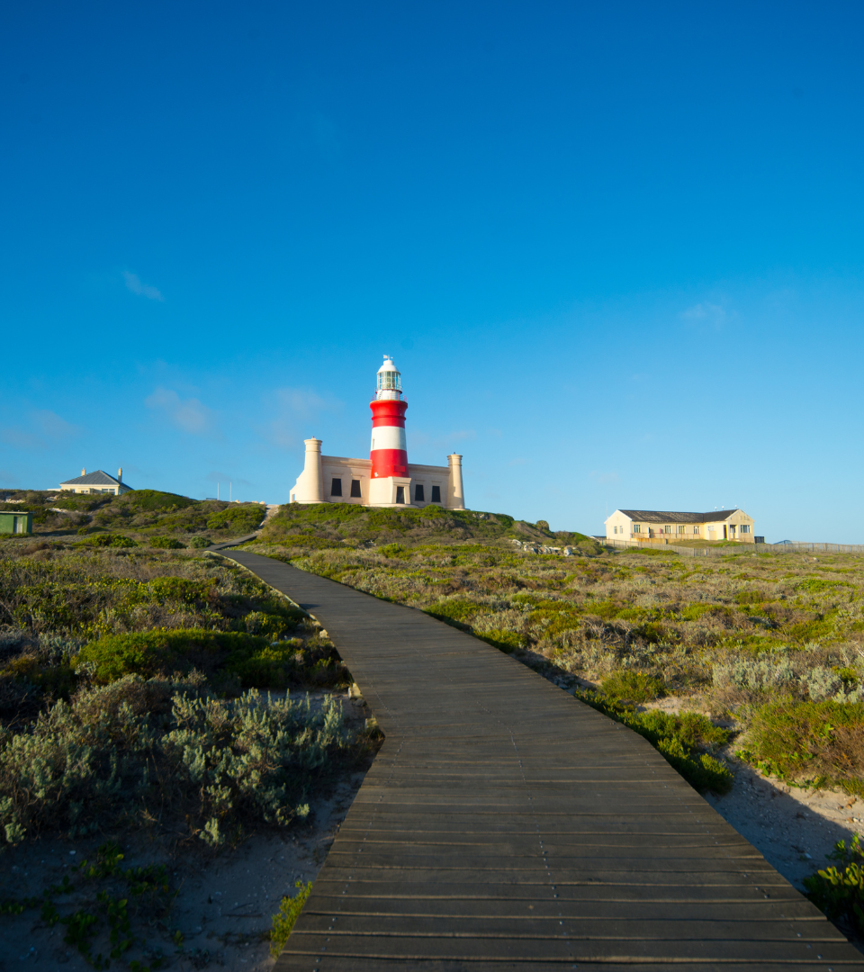 Renowned for its pristine white sandy beaches, Struisbaai boasts the longest continuous stretch of beach in the Southern Hemisphere, stretching for over 14 kilometers along the coast. The town is famed for its iconic red and white striped lighthouse, standing tall as a beacon of maritime history against the backdrop of azure skies and rolling waves.